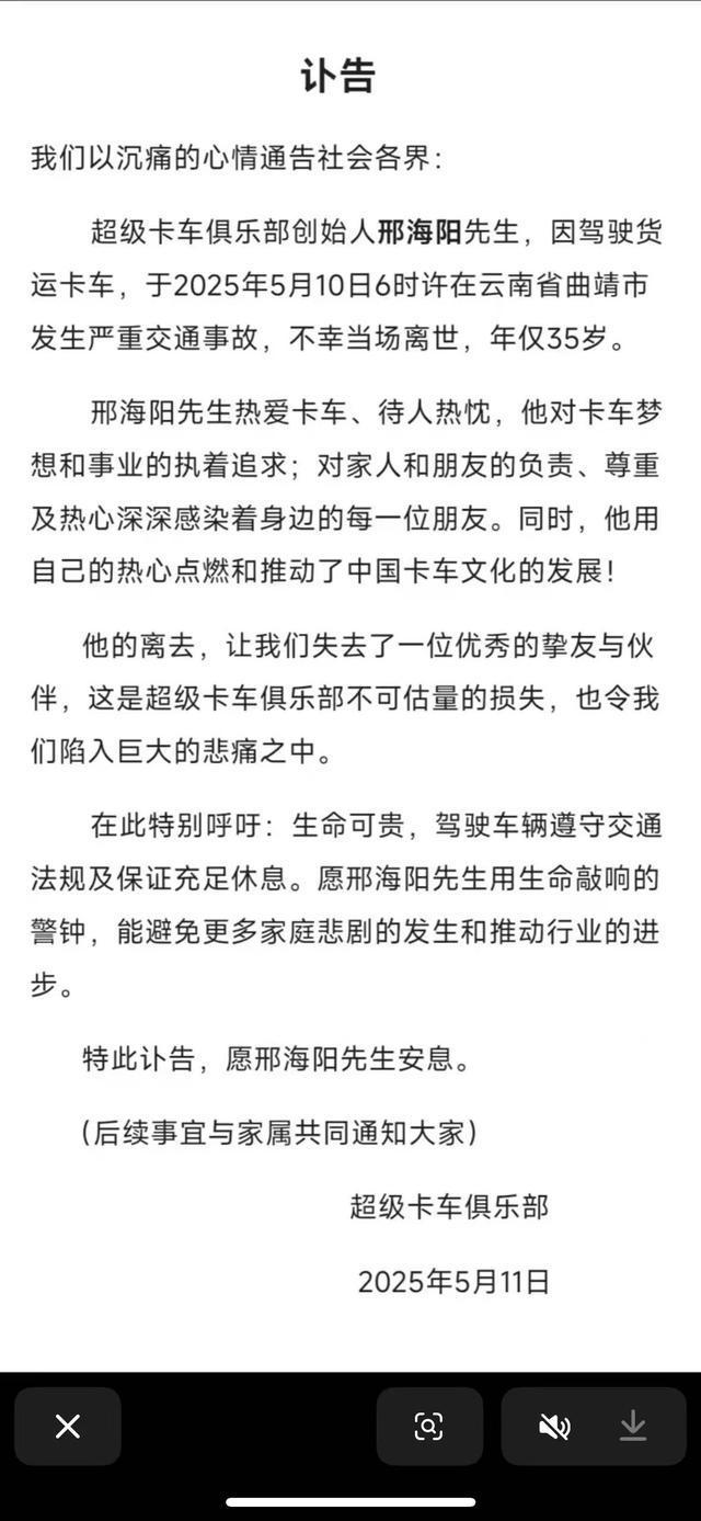 5月11日,“超级卡车俱乐部”正式发布讣告,确认邢海阳于5月10日早晨6时许,在云南省曲靖市境内发生严重交通事故,年仅35岁的他不幸离世。这一消息让无数卡友感到悲痛,也引发了行业内外对长途运输安全问题的高度关注。