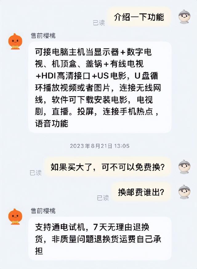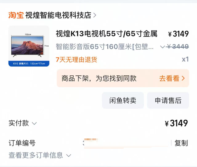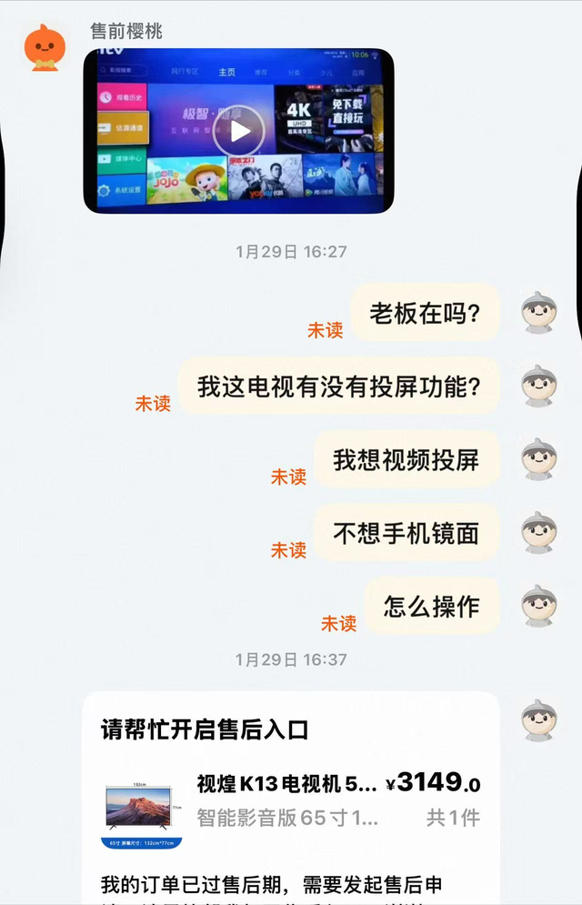 据汪先生介绍,2023年他在淘宝网“视煌智能电视科技店”看中了视煌K13电视机。当时,客服详细介绍了电视的功能,包括“可接电脑主机当显示器、支持数字电视、机顶盒、有线电视、HDI高清接口、US电影播放、U盘循环播放视频或图片、连接无线网络、下载安装软件观看电影电视剧直播、投屏、连接手机热点以及语音控制”等。这些功能让汪先生感到满意,于是他支付了3000余元购买了这款电视。