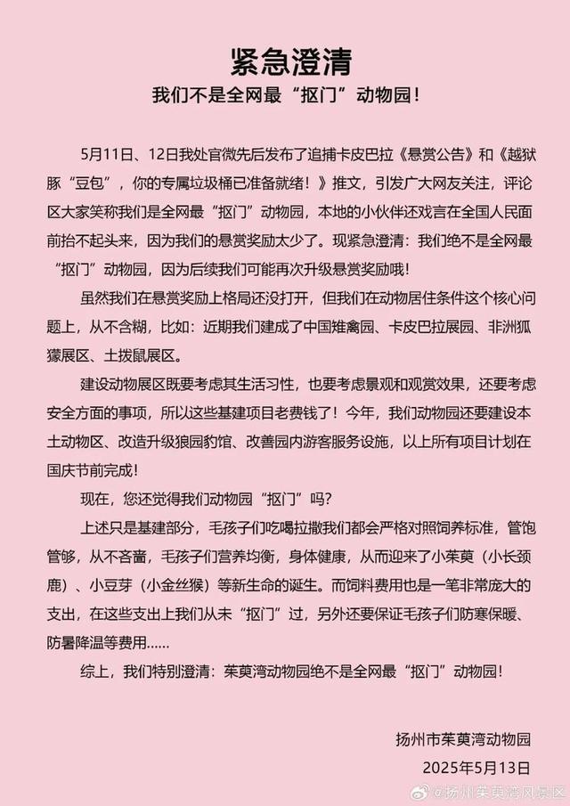 园区“澄清”——我们不是“全网最抠门动物园”,后续将升级悬赏奖励