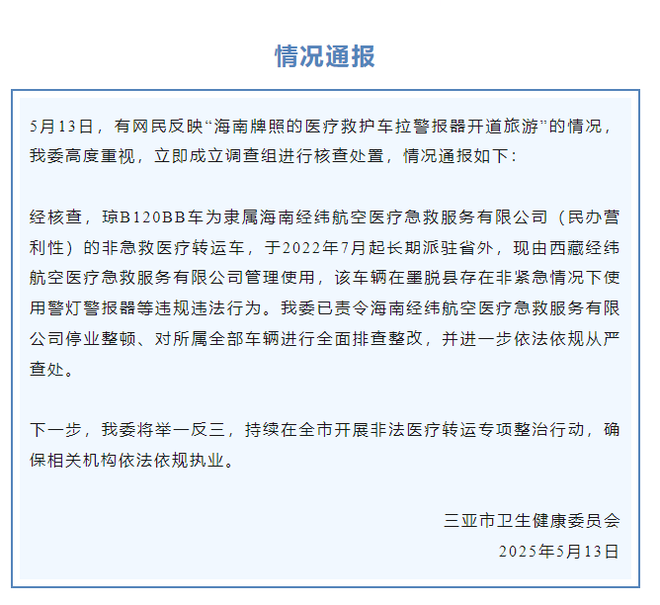 对此,三亚市卫生健康委员会责令海南经纬航空医疗急救服务有限公司停业整顿,要求对所属全部车辆进行全面排查整改,并进一步依法依规从严查处。此外,相关部门还将举一反三,在全市范围内开展非法医疗转运专项整治行动,确保相关机构严格依法执业。