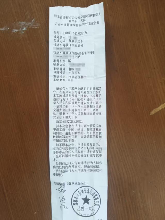 针对此违法行为,邯郸市公安局交通巡逻警察支队丛台一大队迅速作出处理。根据处罚决定书显示,该车于5月11日16时24分,在新兴大街与青年路交叉口东30米处,因“机动车号牌不清晰、不完整”(违法代码:6045),依法被处以200元罚款。