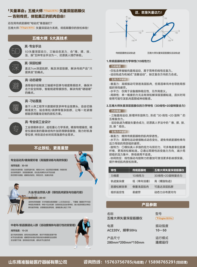 在2025年中国康复医师分会学术年会的展区,山东精准智能医疗器械有限公司展位上人潮涌动。其展出的五维大师V-Engine 5D Pro矢量深层筋膜仪凭借“五维复合力系统”,重新定义了筋膜松解的深度与精度,成为本届年会上备受瞩目的康复技术创新成果。
