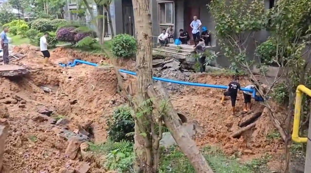 另一段34秒的视频则记录了现场的抢修画面。视频中,一辆挖掘机停靠在塌陷处附近,旁边堆放着大量泥土,多名工人正紧张地安装一根蓝色管道,疑似为修复自来水主管所用。