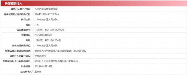 中国执行信息公开网显示,1月16日,合创汽车科技有限公司因被执行人无正当理由拒不履行执行和解协议,被广州市南沙区人民法院列为失信被执行人,涉及服务合同纠纷案件,履行情况为全部未履行。生效法律文书确定的义务显示,被执行人向申请执行人支付金额合计2120556元。